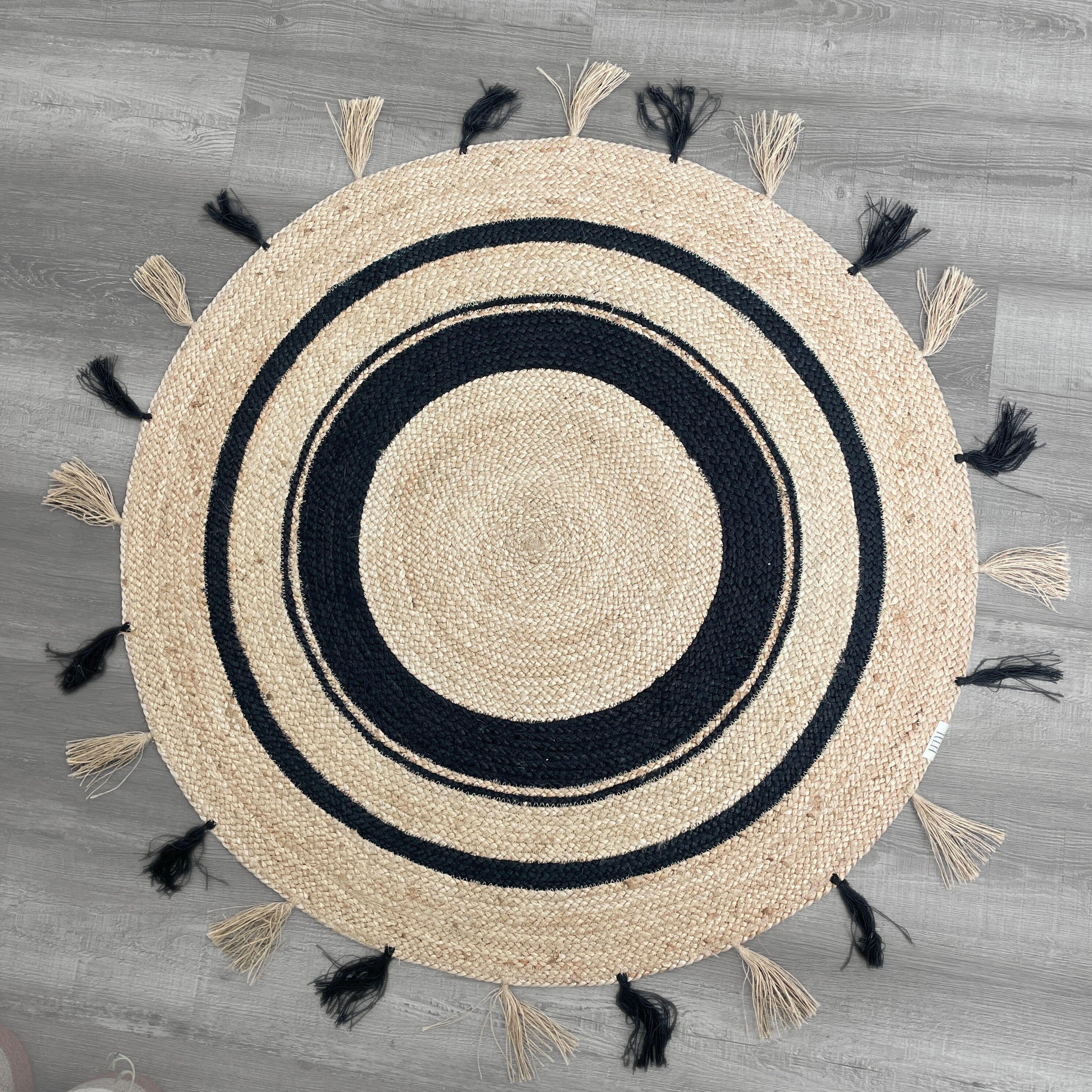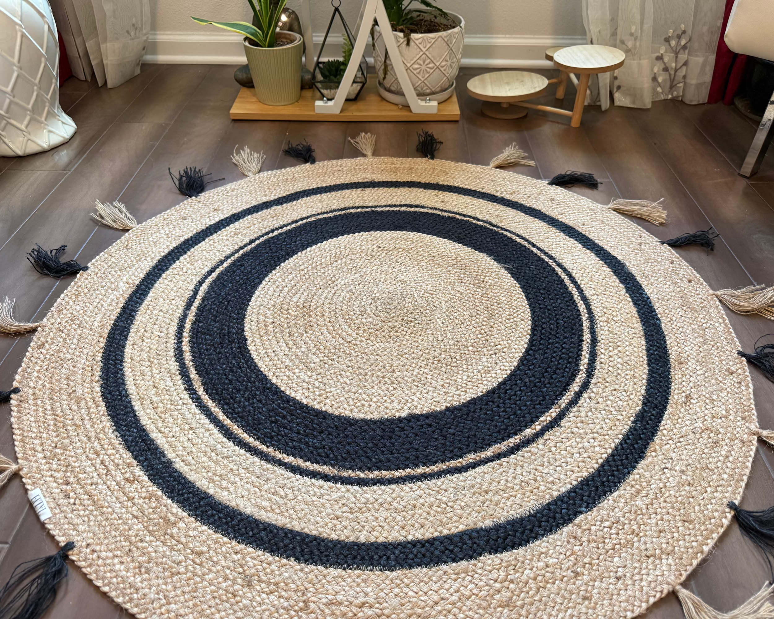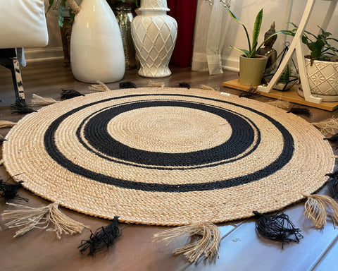 Add warmth and texture to your space with this handwoven round jute rug, featuring bold black circular accents and playful dual-color tassels. Crafted from sustainable natural fibers, it’s perfect for living rooms, entryways, or boho-style interiors. The blend of earthy tones and dramatic black patterns creates a striking statement while remaining versatile for everyday use.