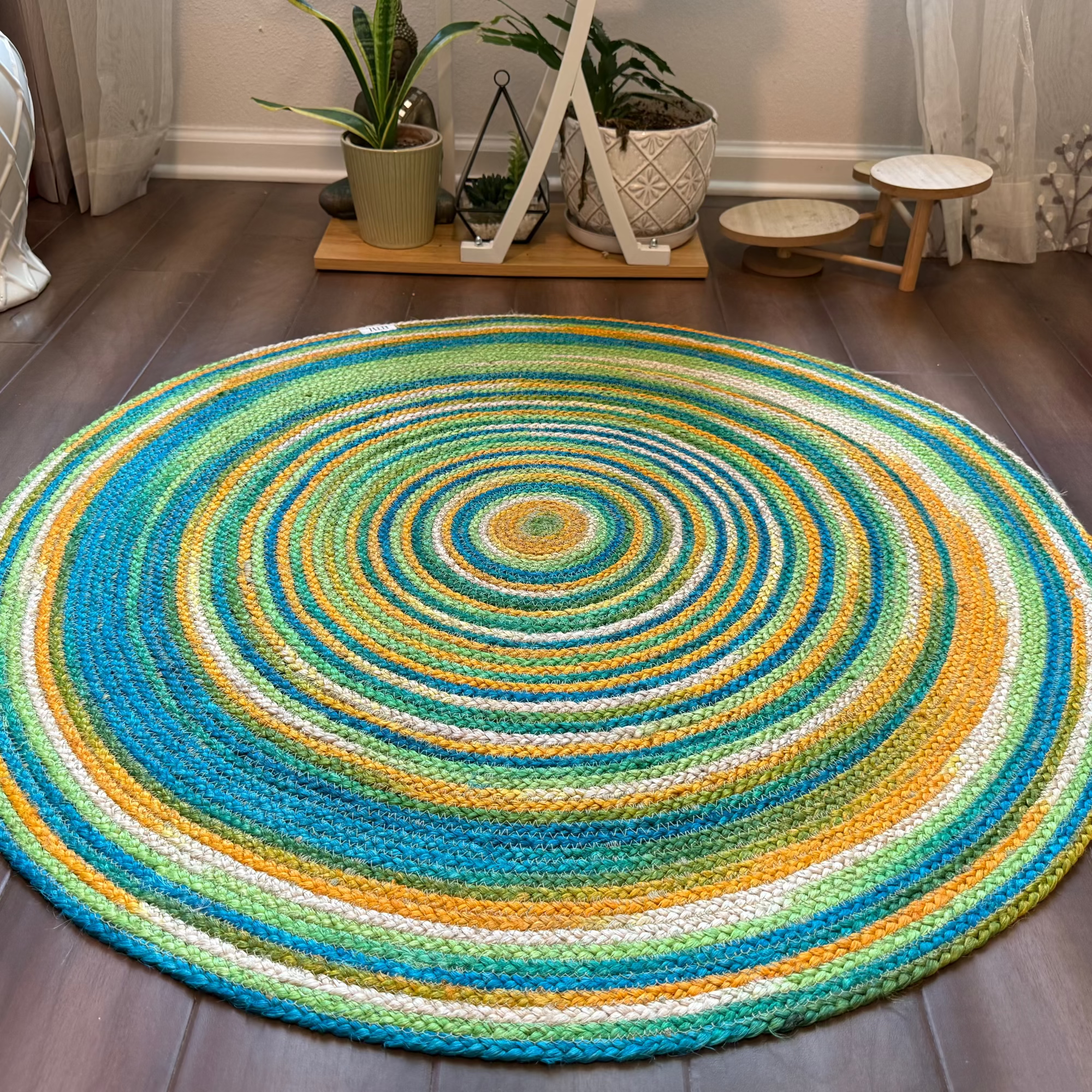 Add a touch of color and natural charm to your home with this hand-braided jute rug. Made from premium, eco-friendly jute, it’s both sustainable and reversible, featuring vibrant hues that brighten any space.